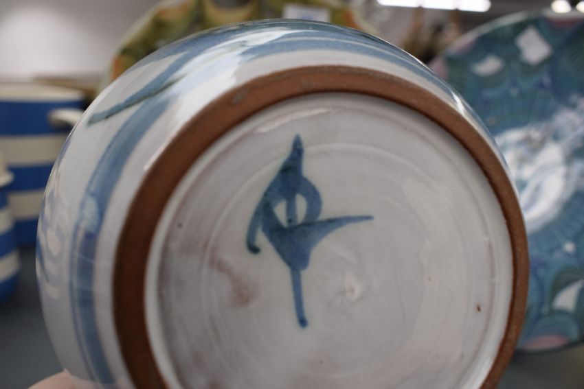 Two studio pottery decorative plates both having floral designs to centre sold alongside a studio pottery jug of similar design, all hsving same markings to bases.