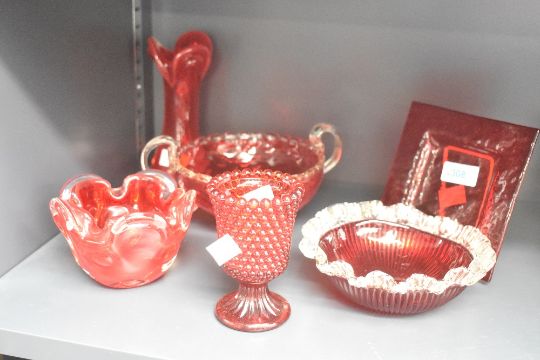 A ruby red glass basket vase having shaped handles, w20cm, sold together with various studio glass ( 6)