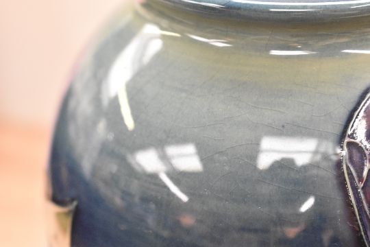 A large and attractive Moorcroft Pottery 'Finches' pattern baluster vase, tube-lined in the typical manner with fruit, foliage and birds, marks to base, measures 30cm tall.