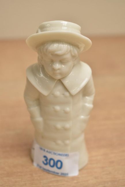A Royal Worcester fine bone china figurral pepperette depicting a young boy in coat and hat, measures 10cm tall., lacking stopper