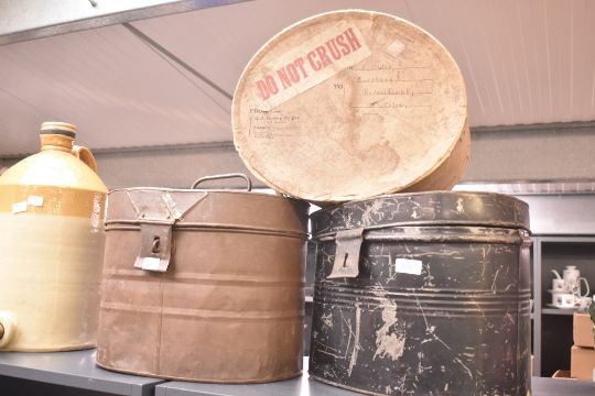 Three antique hat boxes, two metal and one card labelled 'from G.A. Dunn & Co. Ltd. Hat Makers...London'.