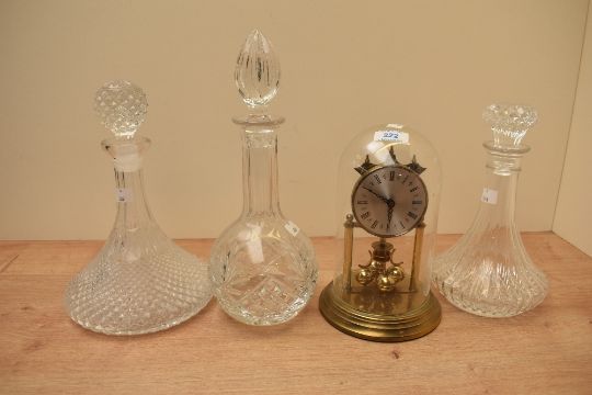 A vintage German 400 day clock in glass dome having Roman numerals to face, sold with three cut glass decanters.