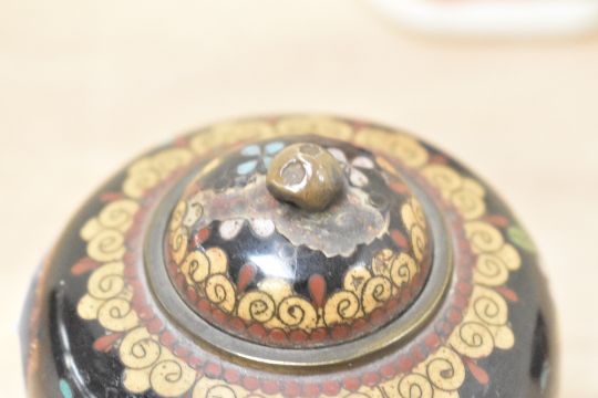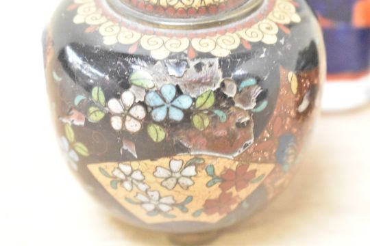 A pair of small Chinese cloisonné enamel lidded jars raised on tripod feet sold together with a vintage Mason's Ironstone style pitcher measuring 16cm tall.