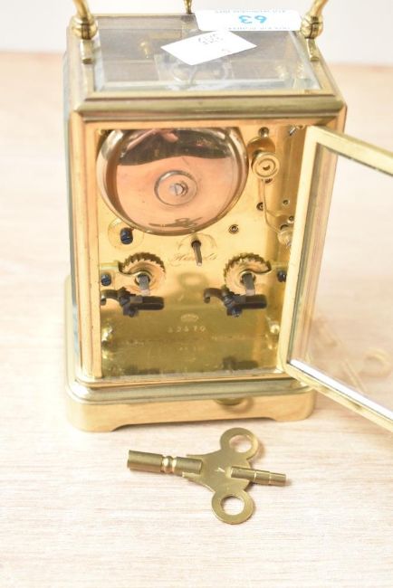 A French brass five-glass repeating carriage time piece, with visible escapepent and repeater button over a dial with Roman hours and rubbed makers details for Henry Marc Paris.