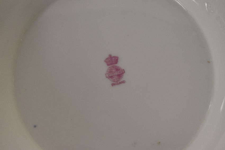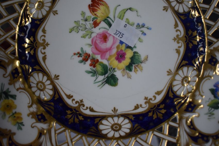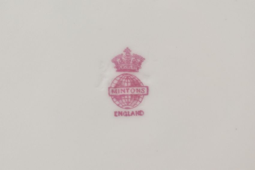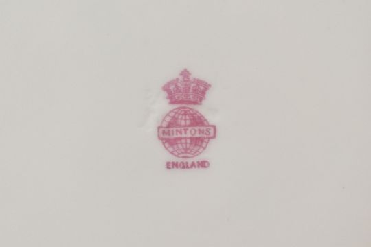 A group of Mintons bone china plates, having basket weave borders and floral designs to centre sold with a bowl in the same design, comprising eleven pieces.