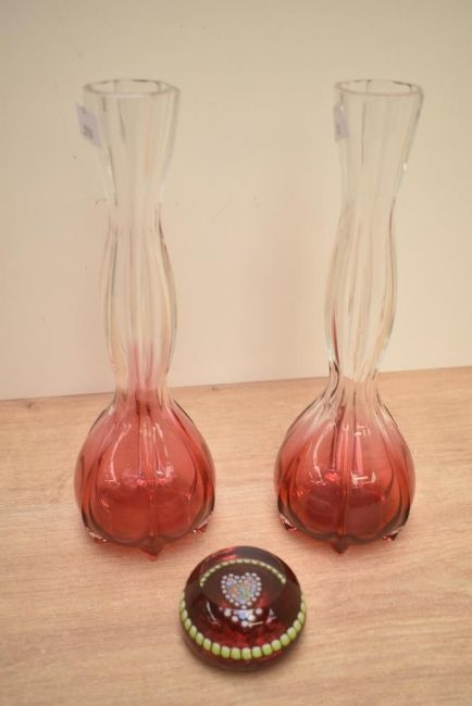 A pair of cranberry to clear glass vases of waisted form, h25.5cm