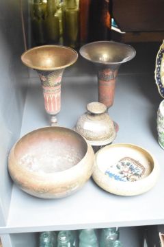 A small selection of eastern Benares type brass wares, two bowls, two flared vases and hand bell.