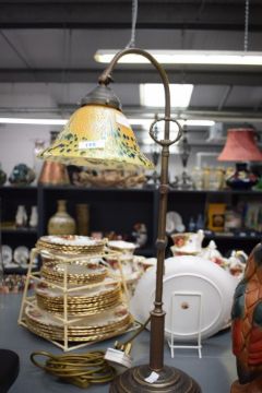 An attractive brass adjustable column reading/ table lamp, having polychrome mottled glass shade, measures 60cm tall.