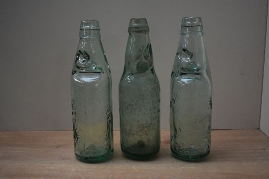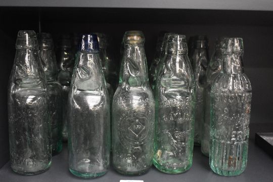 A selection of twenty antique glass Codd necked bottles including names Groves & Whitnell Hulme and Anderson Trade Morecambe etc. *In 1872, soft-drink maker Hiram Codd of Camberwell, London, designed and patented a bottle designed specifically for carbonated drinks. The bottle was designed and manufactured with thick glass to withstand internal pressure, with a chamber to enclose a marble and a rubber washer in the neck.