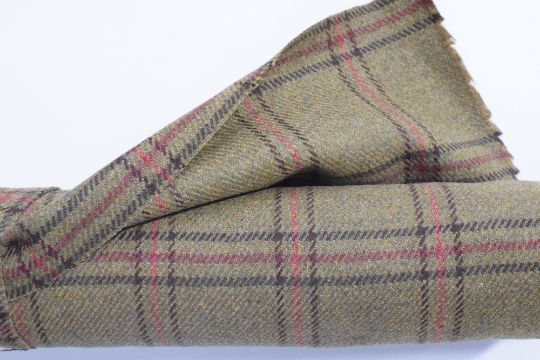 A bolt of Abraham Moon and Sons 100% pure wool tartan, in mossy olive green with brown and wine coloured check, measuring 150cm x approximately 3-4 metres.