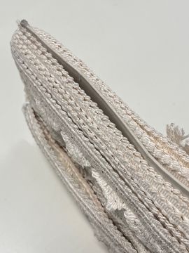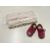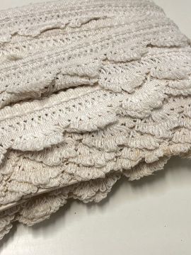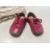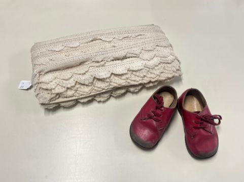 A pair of vintage child's shoes in red leather and a quantity of edging lace for upholstery or home furnishings in cream crochet.