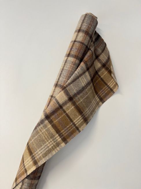 A bolt of Abraham Moon & Sons 100% pure wool tartan, in Autumn - Camel colour way, with shades of brown and beige, rust orange and subtle blue shot through, measuring 150cm wide by approximately 160cm in length.