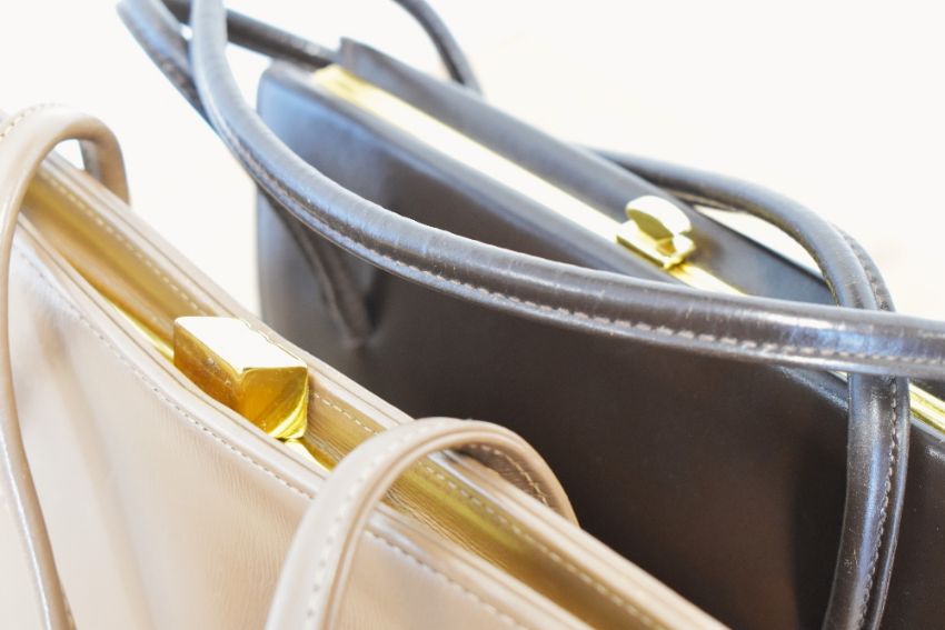 Five leather bags comprising three frame structured handbags, a cocoa brown Waldybag, a taupe Made in England, and a beige quilted textured leather purse style, all having brass frame closures, along with a smooth beige leather and snakeskin corss-body bag, and a pleather shoulder bag with tonal stitched panel detail.