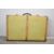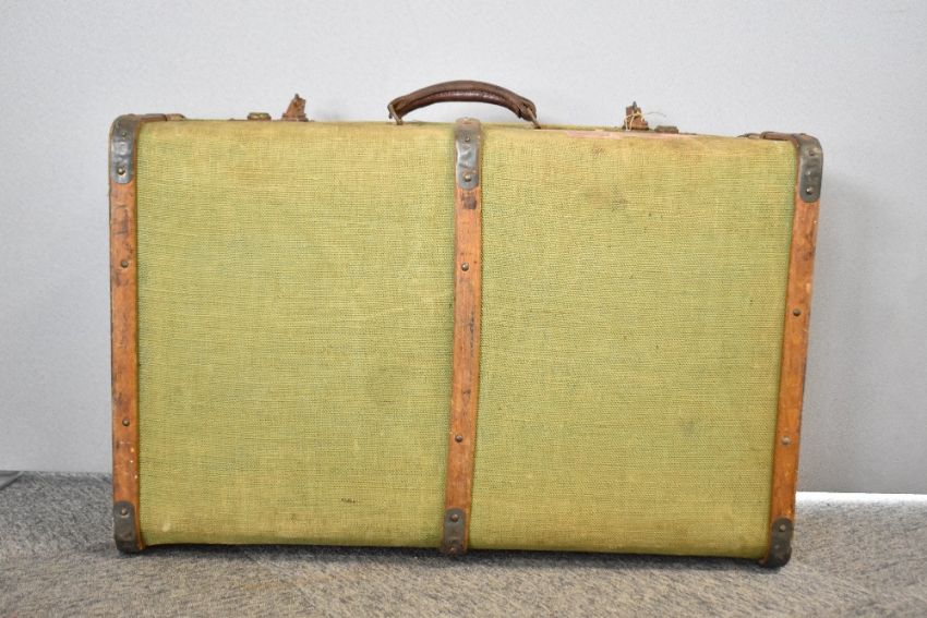 An early 20th century wood-framed suitcase, exterior lining in green canvas, measures 27 x 10 x 18 inches.