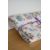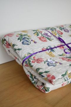 A 1940s vintage quilted bedspread in multicoloured floral design on a woven beige background, alternated with plain stripes in a panel construction, having a soft, linen-feel cotton lining and a wide frill along two edges, measures 92 x 98 inches.