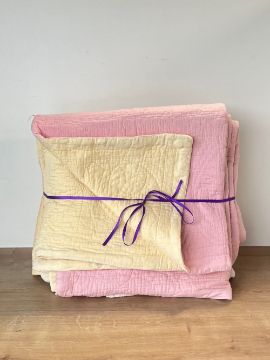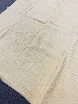 Condition report: There is the occasional loose seam or thread here and there, to be expected within a handmade object of this age. To the yellow sides of the quilts some sun fading in areas, see photos.