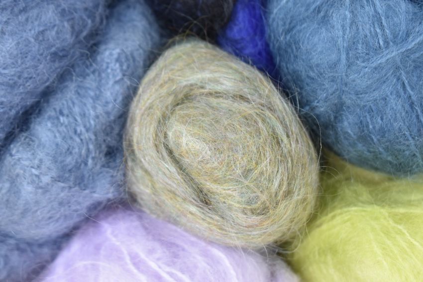 Eleven skeins of mohair wool in a range of colours including sage, lavender, lilac, teal, powder blue, electric blue /black mix, and neon yellow. Makers include Patons, Sirdair Supreme, Biarritz by Richard Poppleton. Provenance: local interest, from a collection owned by the late chairwoman of The Lakeland Guild of Spinners, Weavers and Dyers.