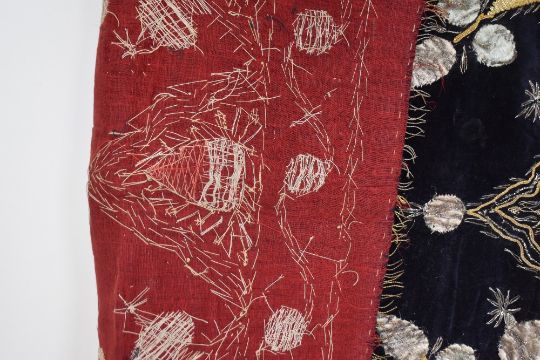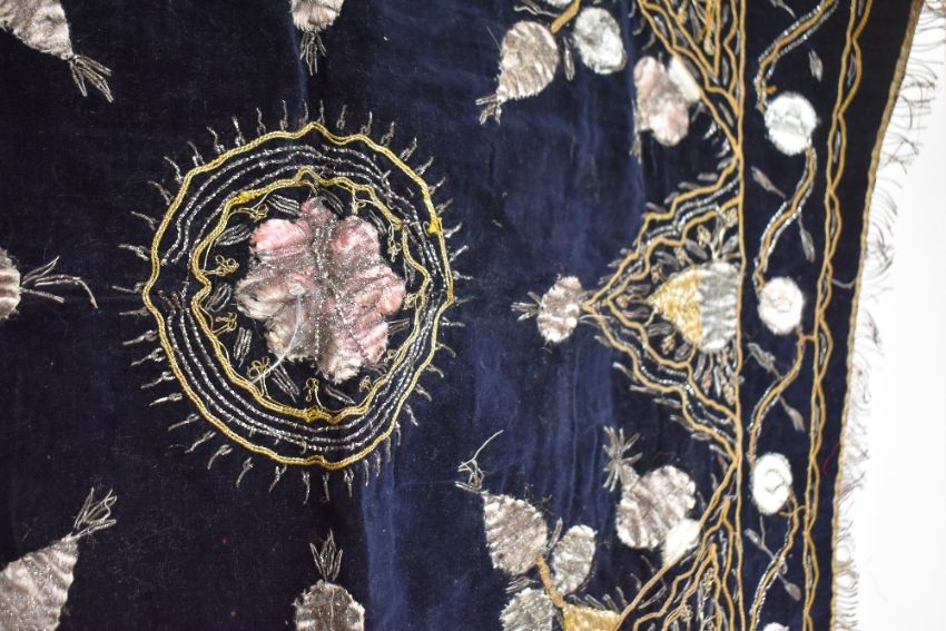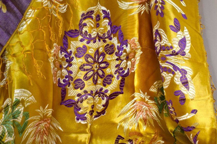 Four fabric WWII souvenirs, to include two Egyptian cotton panel, decorated with chain stitch, dated '1943'...'8th Army of Egypt', depicting a coat of arms, pyramids, camels and palm tree, along with a silk shawl, possibly Thai, having golden yellow ground decorated with gazelles, palms and peony pattern in purple, green and neutral threads, and a black velvet panel in the style of Burmese Kalaga, embroidered with gold and silver threads in a symmetrical floral arrangement, has signs of wear such as pulled threads and fuzzy scuffing in areas.