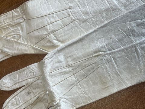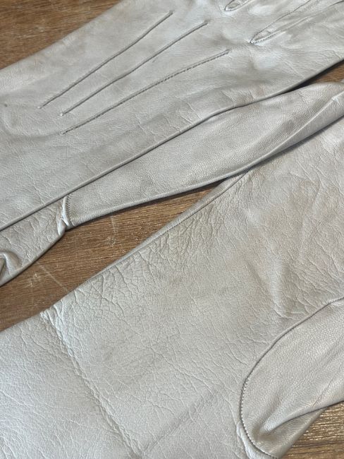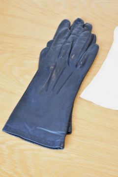 Five pairs of vintage ladies leather gloves, in navy, two cream, pale taupe, and black respectively.