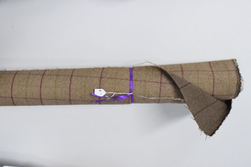 A large bolt of Fryetts wool / cotton blend curtain fabric in 'bamburgh Heather;' colourway, having a cool brown base with burgundy windowpane check, measuring 150 cm by approximately 2.5m.
