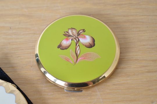 Three 1950-1970s Stratton compacts with the Orchid transfer design. The two Stratton Convertible models measure 3 1/4 inches, a black lacquer fronted mid 50s - 60s has the sifter intact, and a cream lacquer fronted mid 60s - 70s. The other green lacquer fronted measures 3 inches, has bubbling across the mirror. All have thumb-release inner rim lids.