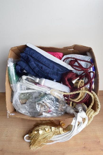 A large quantity of upholstery trimmings, edging, cording, webbing and ribbon, along with ready made curtain ties, tasselled and twisted, plus other sewing and needlecraft tools, one box and two fabric cases.