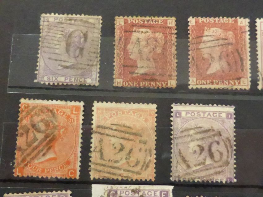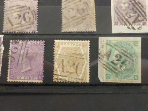 GIBRALTAR STAMPS OF GB CANCELLED IN GIBRALTAR G OR A26 CANCELS Card with 16 values of items all stamps from Great Britain, used and cancelled in Gibraltar. Includes single value with Z2 G cancel, the rest with A26 cancels, includes 1d reds plate 124 and 165, 2 1/2d rose plates 2, 7, 11, 4d vermillion plate 11, various 6d values and others through to 1 shilling. Odd items on piece, mostly off paper.