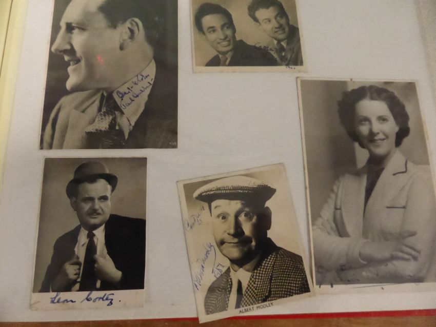 POSTCARDS & REAL PHOTOS SIGNED COLLECTION OF 70+ 1940's CELEBRITIES IN ALBUM Album with 75 or so postcards and real photographs, all pertaining and signed by Actors,Actresses, singers etc of the 1940's era. The collection has been wonderfully put together by a soldier during the Second World War, who was a Gunner. Along with the photos, some letters and other paper ephemera are noted. Signatures and pictures include Wilfred Pickles, Actor, Comic, and Radio presenter, Albert Modley, Comedian whos famous catchphrase was ' Eeee isn't it grand when you're daft!' Dennis Lawes, Actor Club Night (1957) and I didn't know you cared (1975) Kitty Gillow, Billy Bennett (actor), Velda and Vann (comedians) also couple of Wrestler pictures including Jack Page also known as Dirty Jack Pye and the Doncaster Panther. A truly unique and one off collection. Please inspect.