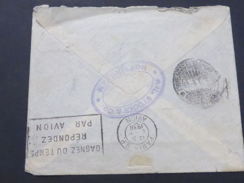 GB, POSTAL HISTORY 1936 COVER UK TO URUGUAY WITH 8 SHILLINGS POSTAGE Cover sent Nottingham to Montivideo (uruguay) in 1936. Cover bears a pair of rengraved seahorses (2/6-) and further 3 1 shilling values. Cover to rear with receiving stamps for Paris (air) and further smudged Monitivideo cancel. Cover has been neatly opened to top.