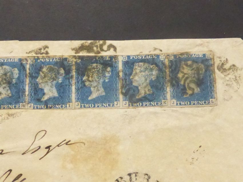 GREAT BRITAIN 1841 2d BLUE IN STRIP OF 7 (JF-JL) SENT TO LISBURN (COVER FRONT) Front of cover with a scarce multiple of 7, 1840 2d Blues (no white line) largely 4 margin all round third stamp bottom tight and sixth value too. We do note a vertical fold affecting the third value JH. Cover sent to Lisburn. Scarce early multiple.