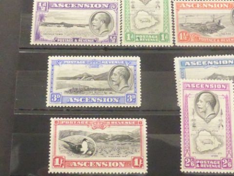 ASCENSION GV 1934 DEFINITIVES, SET OF 10 IN CARD ALL MINT Card with mounted mint set of 10 definitives from Ascension, dating from 1934. Generally lightly mounted mint.