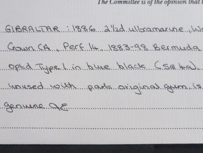 GIBRALTAR 1886 2/1d BLUE STAMP OF BERMUDA OPTD GIBRALTAR IN BLUE-BLACK + BPA CERT 2/1d ultramarine, with crown CA wmk stamp of Bermuda optd type 1 in blue black (SG4a). Value is unused with part original gum to rear. Complete with BPA cert from 1995.