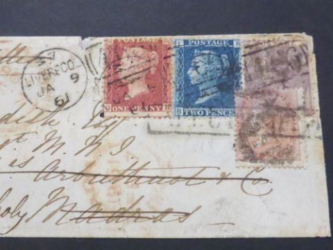 GB/INDIA POSTAL HISTORY 1861 COVER TO TRICHINOPOLY INDIA WITH GB & EAST INDIA STAMPS Interesting cover, sent to a member of the 15th Regiment MNI (Madras Native Infintary) in January of 1861, to Trichinopoly (Tamil Nadu) Cover bears a penny red, 2d blue (pl8) and 6d All tied with Liverpool obliterator and CDS. Two feint red handstamps to front. Further more an additional 2A Orange East India (SG44) added with rectangular cachet (not readable). To rear a receiving stamp for London on the day after being sent from Liverpool, and further cancel for we believe in February. Cover a little tatty to left hand side but a unique piece.