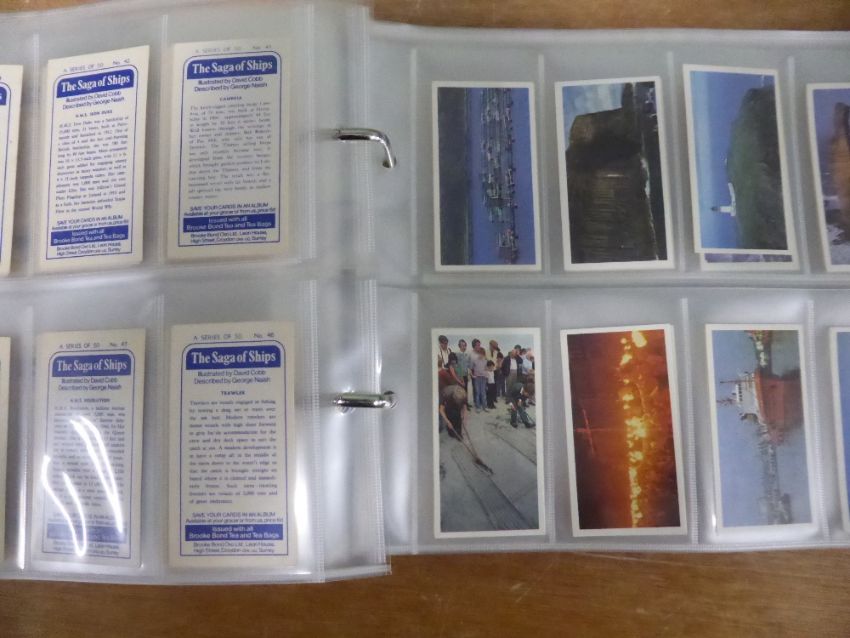 TRADE CARDS, BROOKE BOND TEA, SHELL OIL (NEW ZEALAND) MORNFLAKES, FACCHINO's ETC 4 Albums and three further boxes and pile of loose trade cards, much tea orientated with 4 volumes of Brooke Bond Tea cards by sets further two boxes of sets still sealed with some with albums and or wall charts (unused) with sets through to the 1990's Further box with mix of part sets and does include cigarette cards. Thereafter loose cards (all in sleeves) inludes Facchino's Cinema Stars, Shell Oil New Zealand 1963 Aircraft of the World, Mornflakes and more!
