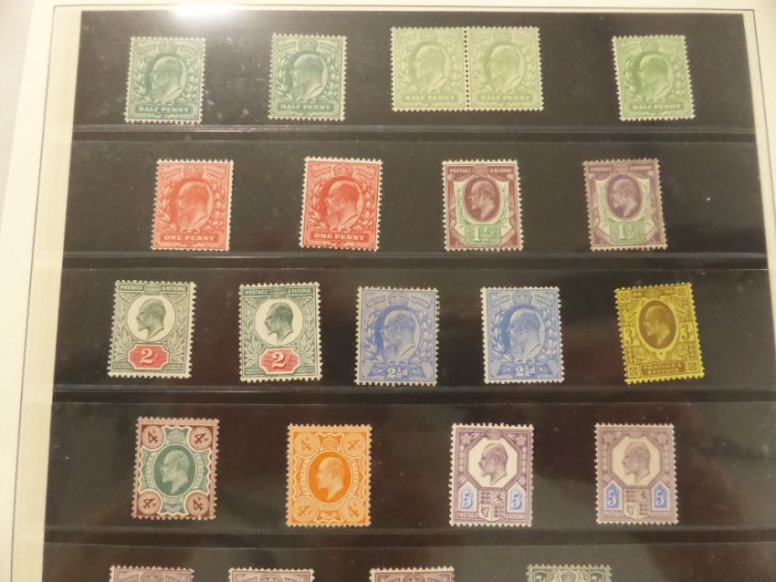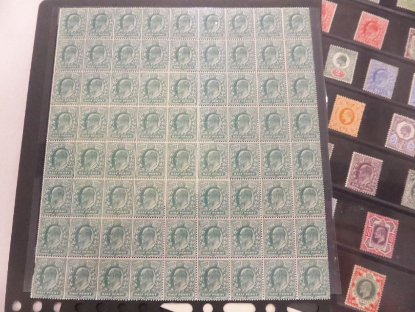 GB EVII RANGE OF MINT VALUES TO 1 SHILLING + MULTIPLE OF 72 OF HALF PENNY Hagner sheet with 28 values, most mounted mint, odd unmounted with values to 1 shilling. In addition a block/multiple of 72 of the 1/2d blue green. (MNH)