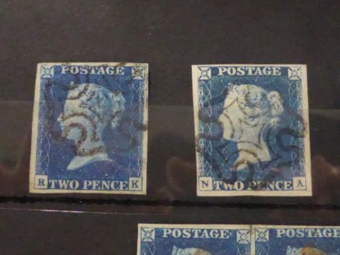 GB 1840 2D BLUE - RANGE OF 4 MARGIN EXAMPLES IN CARD, INCLUDING PAIR Card with 5 2d blues from 1840 (no white line) all are 4 margin with value to left having numerical cancel, (possibly 4) to middle further two single values and a pair with tight bottom margins.