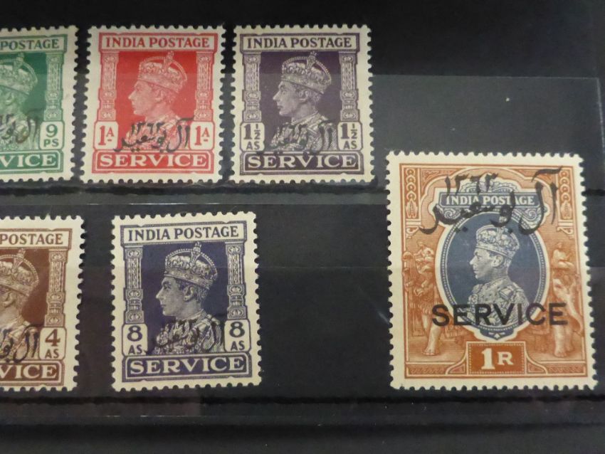 MUSCAT GVI 1944 STAMPS OF INDIA OPTD - 2 SETS AL-BUSAID DYNASTY & OFFICIALS Two cards, each with set from 1944 for Muscat, all stamps of India optd. All overprinted Al Busaid 1363 in Arabic script. Mounted mint