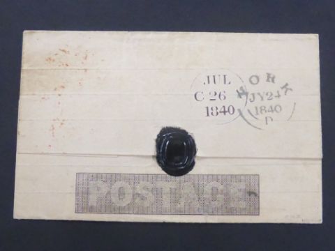 GB 1840 1D MULREADY LETTER SHEET - USED A very attractive 1d Mulready with fine red maltese cross to middle. Forme number obscured by wax seal in black, but two further backstamps one for York on July 24th and further receiving on for 26th.