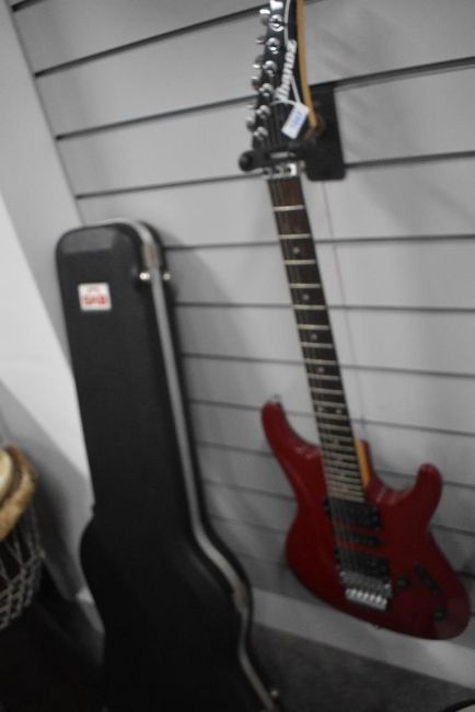 Ibanez 450S - S series solid body electric guitar model introduced by Ibanez in 1990. It was originally part of the Roadstar Pro series. The 450S was produced in Japan by FujiGen. Serial No F100135 The S series is distinguished by the sleek double cutaway body shape which is arched on the top and back resulting in a fairly light guitar with thin edges. The 450S features a mahogany body bolted to a maple Wizard neck with a 22-fret rosewood fingerboard with dot position markers. It has dual Ibanez Vintage Humbucking pickups mounted in pickup rings at the bridge and neck flanking a single-coil. Components include an Edge double locking tremolo bridge and a locking nut. The 450S has a traditional bolt-on neck joint with a stamped metal plate.Used but in very good condition it comes in a SBK hard case which has suffered some damage to the lining