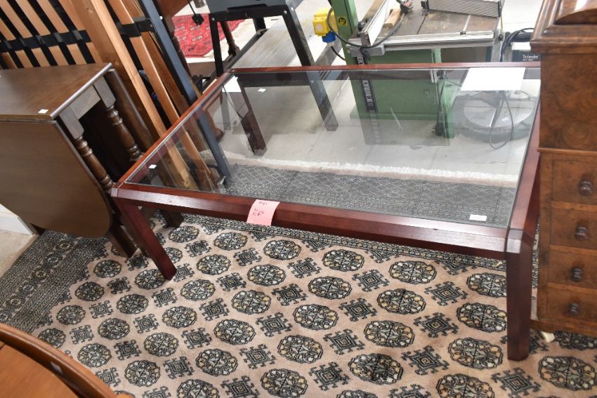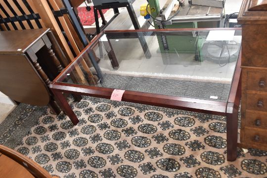 A vintage glass top coffee table having mahogany effect stained frame, dimensions approx. 130 x 80 x 45cm