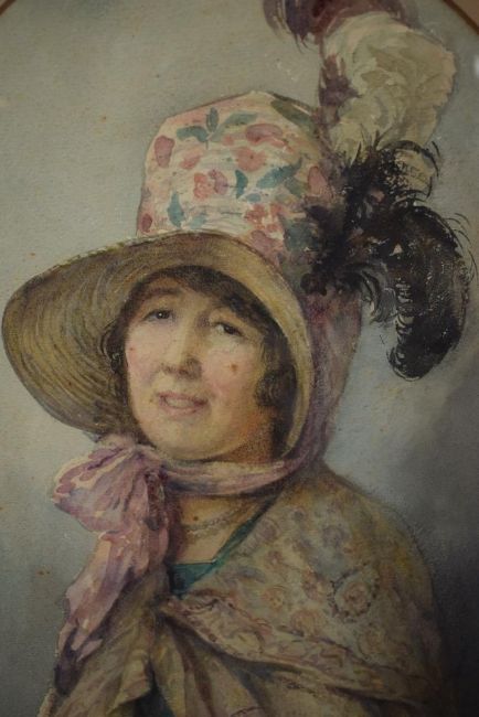 Elizabeth Brockbank (1882 - 1949) watercolour, depicting a young woman in feathered hat, signed and dated (1923?) to lower left, within oval card mount and gilt frame, under glass 26.5cm x 36cm & 39cm x 49.5cm overall.