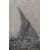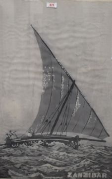 Contemporary monochromatic print on fabric 'Zanzibar' depicting a sail boat at sea, in a black frame, under glass 51cm x 76.5cm & 55.5cm x 81cm overall.