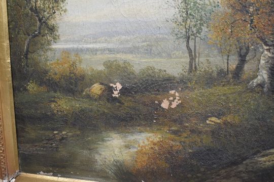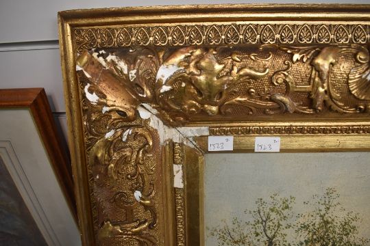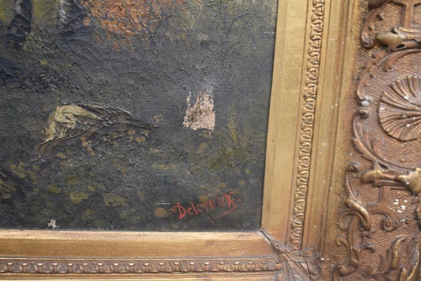 Delcroix (19th century) a pair of large oil on canvas's, each a woodland path scene with figure, signed lower left and right, within ornate moulded giltwood and gesso frames 50cm x 87cm & 81cm x 118cm overall. Cracquelure to both, one with tear to lower right above signature, and some paint flaking and losses, both with cracking and depletions to frames.