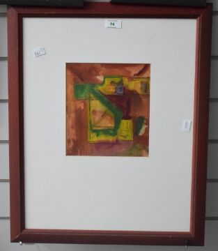 Manfred Robertz (Polish? 20th/21st century) acrylic on paper, abstract composition, signed lower right, within a broad white card mount and moulded mahogany frame, under glass 21cm x 19cm & 55cm x 45.5cm overall. Sold together with a set of four smaller abstract compositions by the same artist, each signed and dated 91, mounted, framed and glazed 27cm x 21cm overall.