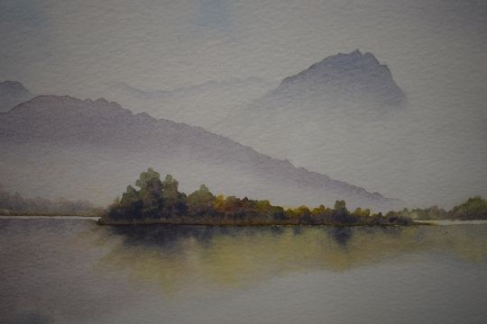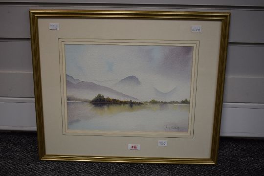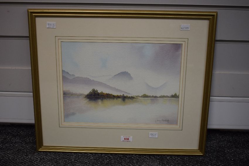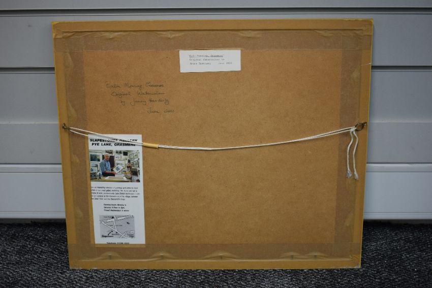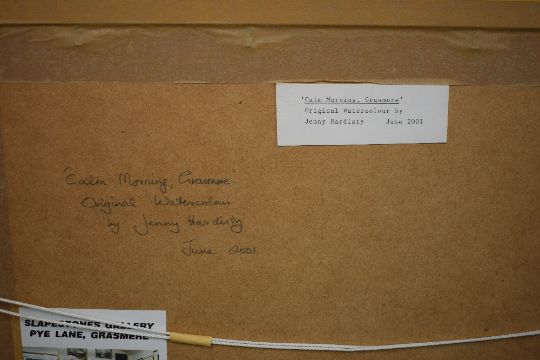 *Local Interest* Jenny Hardisty (British Contemporary) watercolour 'Calm Morning, Grasmere', an attractive watercolour looking from the shore of the southern end of the lake towards Helm Crag and Dunmail Raise, signed in pencil to lower left, counter signed titled and dated (2001) verso, within stepped card mount and moulded gilt frame, under glass 34.5cm x 24cm & 53.5cm x 44.5cm overall.