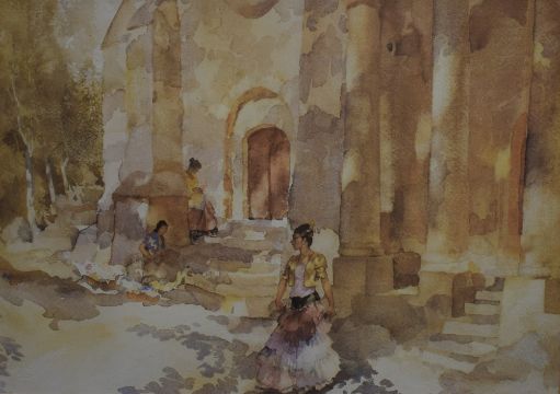 After William Russell Flint (British 1880 - 1969) a pair of lithographs, the first 'Re-painting Oar Blades', in white card mount and gilt frame, under glass 33.5cm x 23.5cm & 58.5xm x 48.5cm overall, sold along with 'Gypsies Outside a Church', blind stamp to lower left corner, in stepped card mount and gilt frame, under glass 33.5cm x 23.5cm & 48cm x 37.5cm overall.