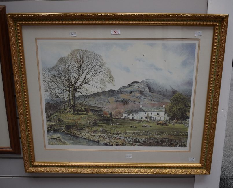 *Local Interest* After Alan Ingham (British 1932 - 2002) lithograph 'Pastorale' a depiction of Low Yewdale farm near Coniston in The Lake District, titled to centre margin with Fine Art Trade Guild blind stamp to lower left, signed in pencil to lower right and numbered (549/850), within stepped card mount and gilt frame, 62cm x 45.5cm & 85cm x 71cm overall.