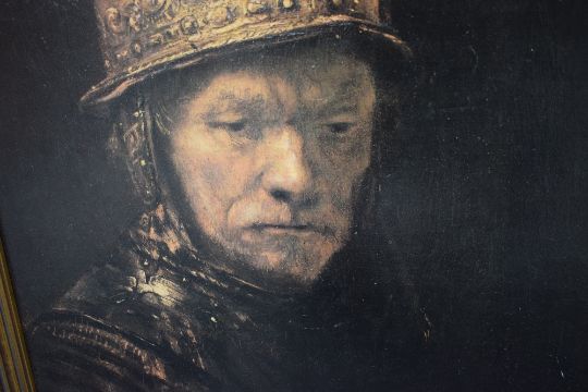 After Rembrandt (Circle) (Dutch 1606-1669) oleograph 'The Man With the Golden Helmet a reproduction of the iconic painting on board, within moulded gilt frame, 41.4cm x 55.5cm & 57.5cm x 71cm overall.