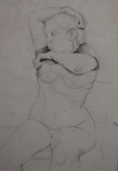 Two British contemporary female life studies, the first a pencil sketch of a woman undressing, indistinctively signed lower right, in card mount and wooden frame, under glass 38cm x 54cm & 51.5cm x 68cm overall, along with a pastel drawing of a woman kneeling, indistinctively signed lower left, 49.5cm x 56.5cm & 64cm x 71.5cm overall both with marks to glass.