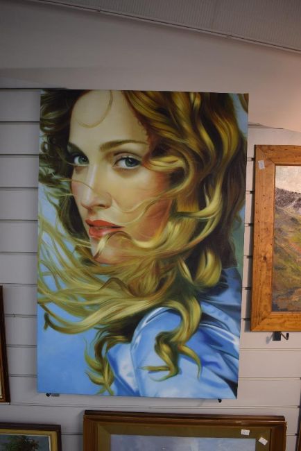 Contemporary portrait of musician Madonna, acrylic on canvas, an accomplished depiction in blue tones, signed indistinctively and dated '03/08' verso, 61cm x 92cm overall.